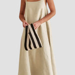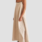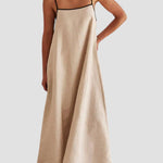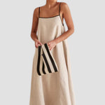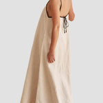Il Carmela maxi abito in lino è perfetto per feste estive all’aperto. Realizzato in lino naturale, con spalline nere a contrasto e dettagli con fiocco sulla schiena, questa vestito unisce stile e comfort in modo impeccabile. Abbinalo a tacchi neri o sandali per un look elegante e senza sforzo.