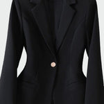 Una giacca senza tempo con una vestibilità elegante che esalta la femminilità e lo stile. Il singolo bottone sul davanti aggiunge raffinatezza, mentre le tasche dalle linee pulite rafforzano il carattere minimalista del capo. Ideale sia per look professionali che per uscite serali raffinate.