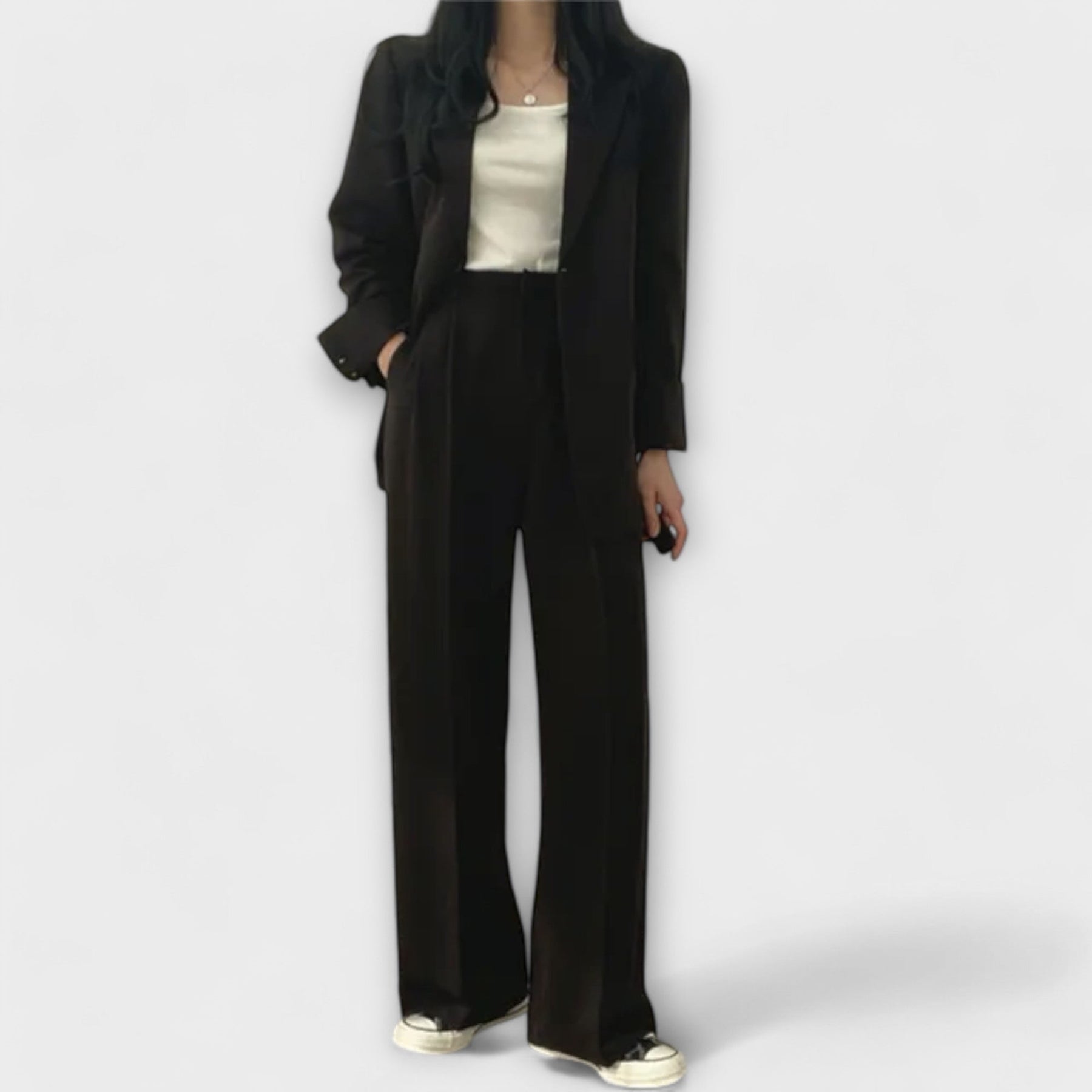 Aggiorna il tuo guardaroba professionale con il Completo Donna a Due Pezzi Nova, un classico completo che emana classe ed eleganza. Questo completo senza tempo è ideale per riunioni di lavoro, occasioni formali e ovunque tu voglia fare un'impressione raffinata. Realizzato con materiali di alta qualità, offre una vestibilità confortevole e una durata nel tempo. I pantaloni dal taglio aderente e la giacca elegante creano una silhouette accattivante, evidenziando la tua sicurezza e il tuo stile.