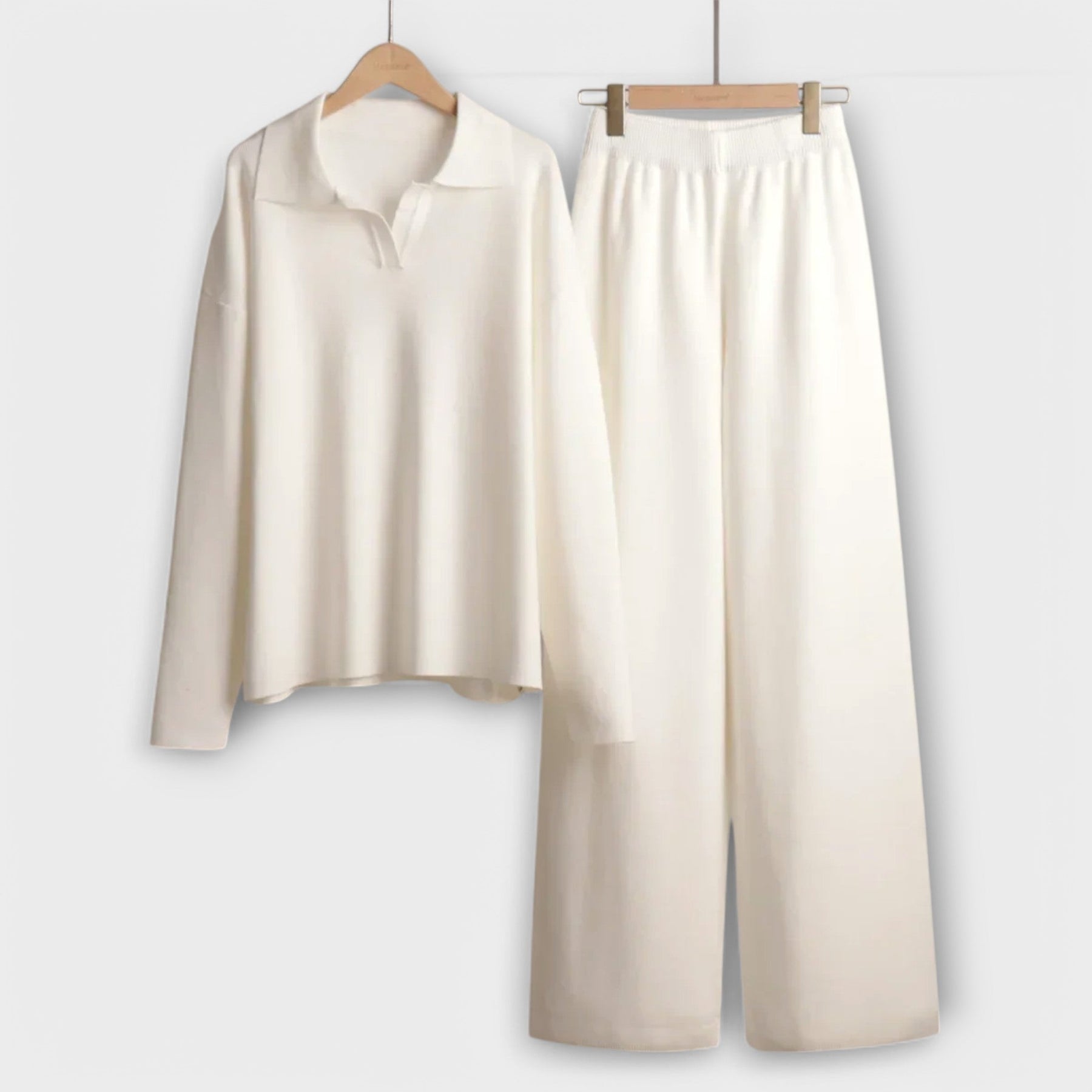 Completo da donna in maglia elegante composto da un maglione largo e pantaloni ampi. Realizzato in un materiale morbido e piacevole al tatto, garantisce comfort e un aspetto elegante. Il maglione ha spalle leggermente cadenti e un colletto delicato che gli conferisce un carattere moderno. I pantaloni ampi sottolineano lo stile casual e alla moda, ideale per le giornate più fresche. Il completo è perfetto sia per look quotidiani che per uscite più informali.